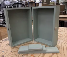 トランク風小物ケース ディスプレイも、持ち運びもできるトランク風小物ケースです💕 飾りたい物があるので、先生に相談して棚の高さなどを調整しました 優しく相談にのっていただいて満足な小物ケースが完成しました✨ ありがとうございました🙇今日もとっても楽しかったです☺