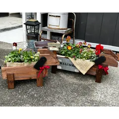 ドッグプランターにお花植えました♪ 先日、ワークショップで作ってきたストアオリジナルのドッグプランターにお花を植え込みました🌸🌼 細長いので、横並びに植えました麻布を敷いて、ガーデンシクラメンは買ったポットのまま、他は前にIKEAで買ったプランターがすっぽり入ったので、そこに穴を開けて植え込みました♪ 赤いリボン🎀