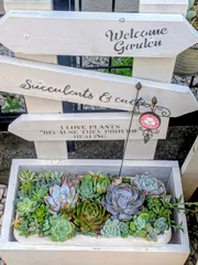 NEW ガーデンサインプランター 何年か前にワークショップで作ったガーデンサインプランターに寄せ植えしました😍