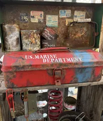前回投稿した工具箱錆ペイントもできたので完成しました😁💕 初めは赤1色だけだったのですが「1色だけってよくあるよね…」て思い🤔少し太めの青いラインをいれることにしましたその後、錆ペイントと英文字のステンシルもたして完成しました蓋を開けて使用したいと聞いてたので古道具の錆棒を使う事にしました