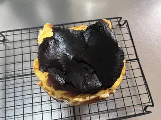 バスクチーズケーキ🧀🍰 クリスマスケーキ🎅🎄🎂の予約をすっかり忘れてたので急遽チーズケーキ🧀を作りました😅 一応猫型です😸笑⃝ 前に作った時ユルユルで焼けてない?って思って焼き時間追加追加したらパッサパサになっちゃったので😅今回はユルユルで止めたら中はトロトロでちょうど良い焼き加減で成功👏 美