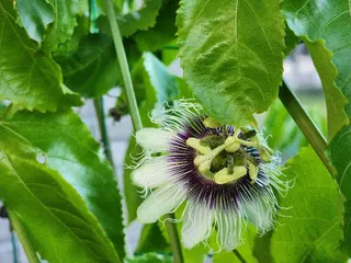 パッションフルーツ 初めての栽培です 今日、やっとパッションフルーツの花確認出来ましたーとても綺麗です 今迄に 2回咲いたのですが知らない間に開花して気が付けば落花🤣🤣でした 今回は蕾が確認できたので毎朝見に行き待ってました人工受粉できました✌️今頃の開花で結実するんでしようか??&nbs