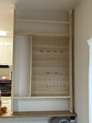 キッチンカウンター換気扇裏に壁面収納を作ろうととりあえず枠を作りました♪1×4材が扱いやすくて作業しやすいことがよくわかりました。このあと、パンチングボードにあわけて枠を作っていきます〜。