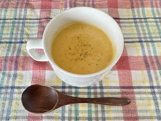 かぼちゃのスープ🎃 ■材料 かぼちゃ 牛乳 コンソメ 塩こしょう ■作り方 かぼちゃは一口大に切り鍋で茹で、湯を切り、マッシャーでかぼちゃを荒くつぶす程度に、弱火にかけながら牛乳を2.3回に分けて入れ、コンソメを入れて弱火で5〜6分煮込み、塩こしょう少々。 ■工夫ポイント今回は皮はむいて、食感を残し