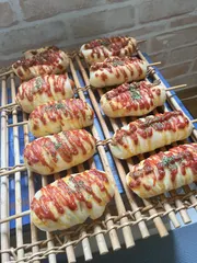 大量生産 週末子供達のために焼いてたパンです! 食べやすい棒付きフランク使ってみました👍 成型3種類、色々試してみました✨ちょっとカットが深くてブサイクさんは奥のほうです笑