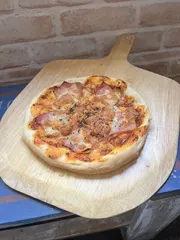 お試し 自家製ピザソース 子供が起きてくる前に自分サイズで焼いてみました! 焼きたてピザ久しぶりに食べました✨ やっぱり焼きたては最高👍具材は、ベーコンとチーズだけですが…😅