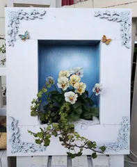 絵画のように植物を飾ることができるフラワーフレーム🖼️夏にはニチニチソウを植えていましたが、この冬は、庭人ブリーダーズコレクションのビオラ「ブゥールローズ」とヘデラ「ピーターパン」を植えています。シックな色合いがお気に入りのフリルビオラです😊