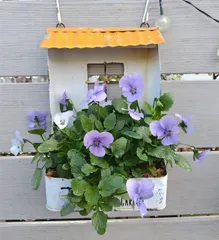 ブリキのハンギング「ビオラ&パンジー」 アイキャッチは、花付きのよい「ラ・ヴィオラ」のブルー植える部分が浅いので、多肉などに向いている鉢だと思いますが、私はいつもビオラやニチニチソウなどの花を植えて使っています😅土はそんなに入らず大きくなりすぎないのでちょうどよく、花が溢れるように咲くのが好きです❣️😊ワイン系のビオラは安い小さな苗だった
