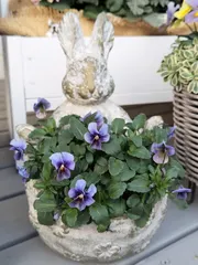北島園芸さんのオリジナルビオラ「藍月-あいづき-」は、藍染のような白地に青紫が滲むように広がる色味と、真ん中の月のような優しい黄色からネーミングされたそうです。うさぎの小さな鉢に植えています。