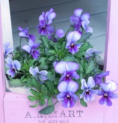 ビオラ「マイガール」 ハート型のハンギングにハート型のヘデラを這わせ、季節に合わせて花苗を入れ替えて4年間使っています🙂「マイガール」は「レディ」の小輪型で、色幅があります。今回は、ブルーが入ったパープル系の色味を選んで植えました。