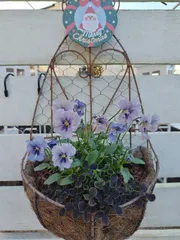 白いビオラ&白いアリッサム&ラミウムで、リングバスケットに寄せ植え🤍プラチーナも少し入っています。中にビニールが付いている長持ちする素材のバスケットで植えやすいです。