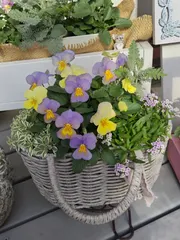 毎年1株お迎えするビオラ「天使の誘惑」は、クリーム色から青紫色へと色変わりするので、1株でグラデーションを楽しむことができます💛💜シレネユニフローラと、夏越ししたシルバーレース、こぼれ種で育ったアリッサムを合わせました。シレネやアリッサムが籠からこぼれるように育つのが楽しみです❣️