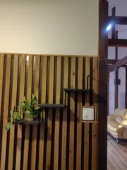 NEW 玄関脇の小さな棚 玄関の格子壁に、グリーンや小物が置ける棚をつくりました。材料はセリアでアイアンスクエアブラケットと棚板はフローリングの余り板をカットして、カインズのアンティークカラーズを塗装
