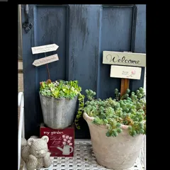 NEW ブリキポットに♪ お友達からもらったブリキポットに、家にある多肉を植え込みました♪ WSで作ったアンティーク風ミニドアオブジェの前に置きました✌️アイアンブルー💙と多肉のグリーン、合いますね💕 多肉は可愛いですね〜💕 ストックの多肉も、この夏の暑さでダメになってしまったのもあ
