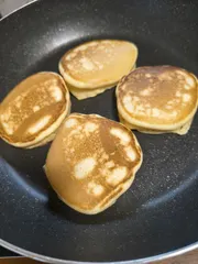 「『ホットケーキ』始めました」 今日は雨ということもあり、とても寒い朝です。寒くなると食べたくなるもの、私の場合、それは決まって『ホットケーキ』 まだ秋は始まったばかりですが、本日、早くも始めてしまいました😁(この後、1ヶ月に1回くらいの頻度で食べることになると思います😋) 我が家は掌サイズの小さいものを何回も