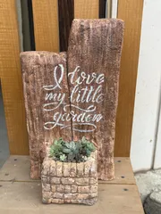 寄せ植えしました 以前にモルタル教室で作った鉢に寄せ植えしました。ステンシルがアクセントになってます。鉢が小さいのでちっちゃいものシリーズで揃えました😊