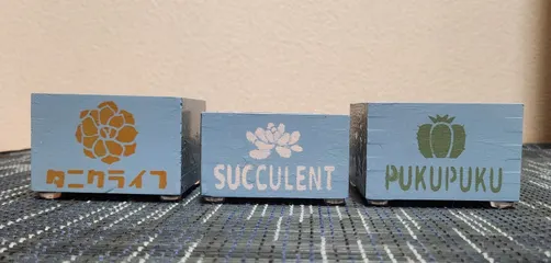 枡をリメイク ■材料枡、塗料、ステンシルシート、ニス ■作り方枡全体に色を塗る底に水捌け用の穴を開けるステンシルをするニスを塗るクッションシールを貼る ■工夫ポイント全体は同じ色でステンシルだけ違う色にしてみました