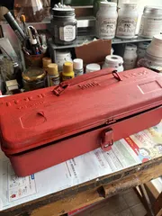 工具箱をペイント👍 こんにちはとってもお久しぶりです。こちらの工具箱ペイントのオーダーをもらいました元の色は青色で、赤色にしてから錆ペイントをして欲しいとの事で預かりました😊赤色のペイントが終わったのでこれから錆ペイントにはいりますまた完成したら投稿します🤗💕