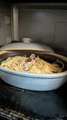 カルボナーラ作ってみた! ■材料スパゲティ1.6(レシピ本は1.4)80g水180ccベーコン1枚万願寺唐辛子(レシピ本はアスパラガス)2本バター5g塩黒こしょう卵黄1個オリジナルで冷凍トウモロコシ適量 ■調理時間レンジ6:30(レシピ本は麺1.4で6分)材料調理レンジ前後で10分程度 ■作り方器にスパゲ