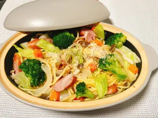 具沢山パスタ レンジで楽チン【パスタポット】を使って具沢山パスタを作りました🙌🏻 ■材料マ・マーの小鍋でつくれる早ゆでパスタ 1人前シャウエッセン 2本キャベツ 1/2枚玉ねぎ(小) 3/4個にんじん 1/3個(冷凍保存したものを使用)ブロッコリー 3〜4個スライスベーコン 1枚しめじ 15g程度コンソ
