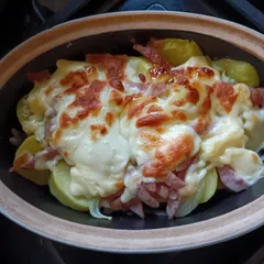 ポテトチーズ焼き ■材料じゃがいも小5個ウインナー2本玉ねぎ少々チーズ適量塩マヨネーズ ■調理時間600w10分トースター250度で10分 ■作り方じゃがいもは皮を剥いて1㎝の輪切り、水にさらしてパスタポットに入れ、塩少々でレンチンウインナー、玉ねぎ、チーズ、マヨネーズをトッピングしてトースターで
