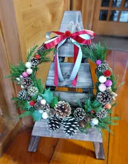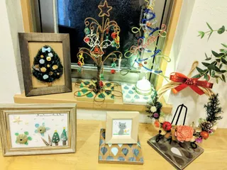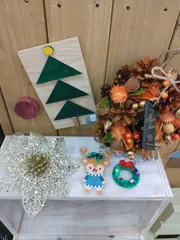■作品内容WSで作ったリーススタンドに木の実や千日紅等で作ったリースを飾りました🏵️・・・職場ですが💦ヒノキの枝で簡単なミニツリーも作りました🌲オアシスに枝を挿し、てっぺんをまとめて結んだだけですが、リボン🎀付けて毛糸をユルッと巻き付けたら可愛くなりました🎄ニラの花殻も赤く塗り、ワンポイントに挿しま