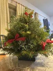 オアシスに、自宅の庭のもみの木と、ブルーアイスを指して簡単に小さいクリスマスツリー🎄小さな木の実、赤いリボンもつけてお部屋の中はグリーンのいい香り