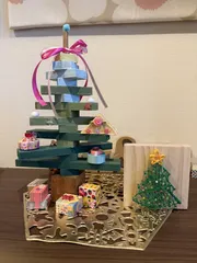 ■作品内容・DIYクリスマスツリー・ヒノキの葉でリース ■工夫ポイント枝?が動くようになっているので、プレゼントがのるように大きさを考えて小さい廃材を選んでマステでまきました。葉の色をグラデーションにしたそうです! ⭐︎クリスマスツリー ※娘の作品です。こちらは某ホームセンターの