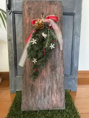 塗装屋さんのモルタル部で作った枕木です☺️フック🪝を付けたのでスワッグ飾りました🎄一日目はモルタルを塗って枕木風に模様をつけました。フシをつけてみましたが難しい😓二回目で色付け。枕木に見えるでしょうか😅