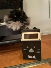 私が以前のにゃん祭りの時に、孫にゃんにプレゼント🎁で、作りました、ちゅ~るBOXと、 ムースです🐈⬛。 ワゴンの下がお気に入りのようです🤭(=^ェ^=)
