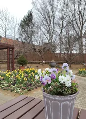 大きめのスタンド鉢に植えていて大株になり、3年間咲き続けてくれたスーパーアリッサムが夏に枯れてしまったので、新しく寄せ植えを作りました。新しく購入したスーパーアリッサム「スノープリンセス」に、色味の違うフリル咲きビオラ「アイクルール」2株ビオラは植えてすぐに、ナメクジに花びらを食べられてしまったので