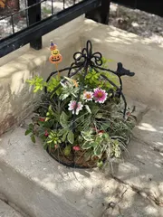 NEW こぼれ種のニチニチソウを寄せ植えに🩷 夏の間は花が少ないので、フラワーフレームには、寄せ植えに使っていたヘデラ「ピーターパン」とリシマキア「ミッドナイトサン」を植えていたのですが、他の鉢にこぼれ種でニチニチソウが小さな芽を出していたので、移植して一緒に植えてみました。3ヶ月ぐらい経って、最近やっとピンクの花が咲きだしました。これからしば