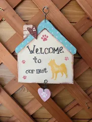 NEW ワンちゃんのウエルカムボード ■作品内容 ドッグハウスをイメージして可愛い💞色合いでペイントしてみました ■作品のこだわりポイント愛犬のイメージと、足型のステンシル型を作りカラーは優しい色合いにしました✨ 家の下に揺れる足型ハートがポイントです✨