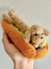 NEW ホットドッグ犬🐶🌭 愛犬が使っていたベッドの布を使って手乗りサイズのホットドッグ犬を作りました☺️■作品内容長年使ってクタクタになったホットドッグの形をした犬用ベッド。捨てるにも思い出がありすぎて( i _ i )ベッドを切って布を再利用して小さなホットドッグ犬を作りました🌭 ■作品のこだわりポイント思い出が