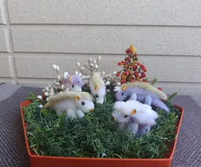 ■作品内容 WS(アンデルセン公園)で教わったラグラスの馬をいくつか作ってみました■工夫ポイント 馬がみんなで草を食べている設定です 後ろの白い木はハゼの実、オレンジはツルウメモドキです鼻と耳はツルウメモドキの殻 ちょっと馬っぽくないのもいますが🤭顔は難しいですね