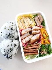 お品書き📝ハーブウインナーと🥦サバの唐揚げ🐟鶏モモカレー炒め🐔卵焼き(シラス、白ネギ入)豚バラ野菜巻🐷(人参🥕エノキ、チンゲン菜🥬) 🍙2個入れてたら、3個ってお返事来たのでもう一つ追加で入れました😆 今朝は冷え込みキツかった🥶ガスコンロで暖まりながらおかず作りました💦🍱おかずの