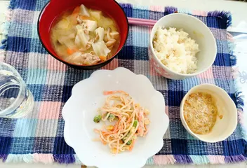 冷蔵庫にあるもので推し活朝ご飯🤣 みずたま食堂🔜急遽開店🈺『朝昼兼用ごはん🍚食べたい〰️😋』とLINEが来まして😳寝起き🥱数分で着替えてキッチンへ🏃🏃🏃冷蔵庫の中見て👀うーん🤔🍚と具沢山お味噌汁、もう一品何にしようか考えてパスタサラダに😁納豆は定番の一品😆👍『美味しー😘』って食べ始めてるのに『Squareの写真撮らせて🙏』って言った