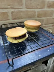 ミニどら焼き 朝食用パンが作れなかったので、ホットケーキにしました。 息子は、薄いホットケーキを好みます…なので小さめで焼いたら、あれ?挟むのあり?って閃いて残ってたあんこと焼き芋ペーストを挟んでみました😊