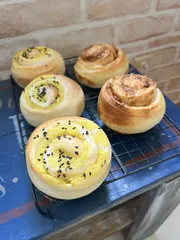 シナモンロールのアレンジ さつまいもとキャラメルパウダーの2種類にしてみました! 最初に習った大好きなシナモンロールのアレンジです。くるくる巻くだけなので簡単成型やっぱりこれを作ると初心を思い出す✨