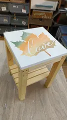 シェルフスツール Love Leaf ラブ・リーフのデザインでステンシルしました。一度やってみたかったんですよね〜B・B!沢山の中から悩みに悩んで決めました❣️メープル(楓)の葉っぱ、我が家では思い入れのある大好きなモチーフです😄 脚のカラーもメープル(もといパイン)で塗ろうとしましたが、濃かった