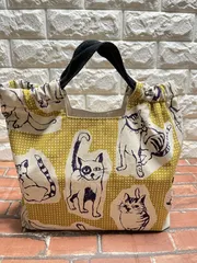 猫柄バッグ👜︎⸝⋆ YouTubeで見つけたバッグを作ってみました。 思ったより大きくて少し大きめのボックスティッシュも余裕で入ります🤭すっぽり😆反対側の柄です·͜· ꕤ︎︎少し角度を変えて👇🏻厚みがあります✨ちょっとヘンテコな猫ちゃん柄がお気に入りです🤭 しっかりする様にと接着芯貼ったら持ち手が固