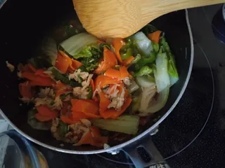 白菜煮 〜ツナ缶あれば、すぐできる〜 ■材料ツナ缶 白菜にんじん、ピーマン、キノコ類(今回は、エノキ)めんつゆ、ニンニク・ショウガ(チューブで大丈夫) ■作り方ツナ缶の油で、白菜を炒めるツナ缶を加えるあとの具材は、アレンジ🆗味つけは、めんつゆ、チューブのニンニクとショウガ ■工夫ポイント無水調理で、旨味凝縮