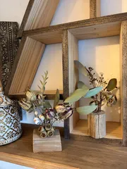端材利用のディスプレイ 鳥かごのワークショップの仕上がり後に端材の木材とグリーンでディスプレイを作っていいよ〜👍🎶って事で木材🪵のひび割れがとても素敵💓キチンと煮沸処理してあるそうです👍✨作りながらこの前作った棚のあの場所に飾ったらいいだろな〜👍💕なんて思いながら作りましたが😊 コレは先生からのプレゼント🎁&nb