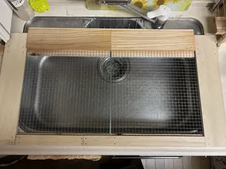 キッチンステンレスシンクには入らないでね! ■作品内容留守中の猫の行動が心配で(キッチンのステンレスシンクに入ってしまうので)シンクに蓋ができる様に工夫した。母の蓄えている端材と100円ショップで購入したキャンプ用バーベキュー網をシンクサイズにあわせて貼り付けただけの簡単なシンク蓋ですが、イタズラ防止になると思う。 ■作品のこだわり
