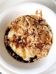 YouTubeで見て作ってみた豆腐餅豆腐に片栗粉と砂糖を入れて、電子レンジで加熱し混ぜるだけ。きな粉と黒蜜で食べてみたら、とても美味しかったです😋