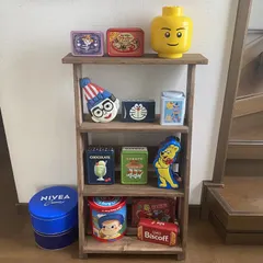 足場風3段ラック 先月の作ったものの大きいサイズでパーツが大きい分カットも組み立ても一苦労だったけどいいのができましたヽ(´▽`)/ヨキヨキ♪-我が家の多肉ちゃんたちを置く予定🌱ひとまずお家ん中に🏠缶缶コレクションの一部を飾ってみました🤭