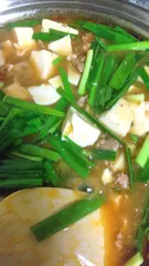 ニラ入り麻婆豆腐 旦那氏用夕飯辛め🌶️麻婆豆腐😁いつもは木綿豆腐ですが、初めてこれ使ってみた😳絹は崩れやすいから大きめに🔪切ってアメリカ産合挽きミンチとニラ1束どっさり🙌このお玉最高🤩✨キレイにこそげる天才オタマ👏洗い物も楽です😆👏 そして胃の調子が悪い私は晩御パン🤭