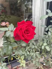 真紅の薔薇咲きました🌹 昨年春、娘の卒業式でいただいた一本の薔薇🌹4年間の思い出が詰まっているように感じて。「挿木してみる?」あまりやったことは無いのですが、もし記念の一株になったら素敵だな〜と、土に挿してみました♪ 2本挿して、ひとつ。上手く育ってくれて。花を咲かせないように、摘蕾。早く花が見たいけど、グッと我