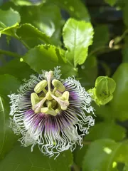 パッションフルーツ 初めての栽培です 今日、やっとパッションフルーツの花確認出来ましたーとても綺麗です 今迄に 2回咲いたのですが知らない間に開花して気が付けば落花🤣🤣でした 今回は蕾が確認できたので毎朝見に行き待ってました人工受粉できました✌️今頃の開花で結実するんでしようか??&nbs