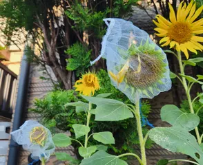 向日葵の種の防鳥対策🐦 ■材料水切りネット■作り方被せてきゅうっと紐を引っ張る■工夫ポイント種を取りに食べられないようにカバーをかけた方がといいと聞き、初めは不織布で作ろうと思いましたがちょうど口が閉まる水切りネットがあったので使ってみました